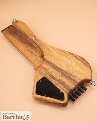 材は、ブラック・リンバで、指板はモラード(パーフェロー)。一体形成でトラスロッドはありません。ボディごと反る事は想定外という事なのだろうと思います。この弦高だと、ほんの少し心配ではあります。弦間隔は18mm の5弦です。